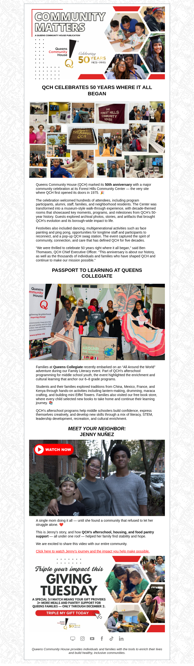 Check out our latest Community Matters, which highlights our community celebration of QCH's 50th birthday, our family literacy event at Queens Collegiate, and the support we provided for Jenny and her family. Click here!