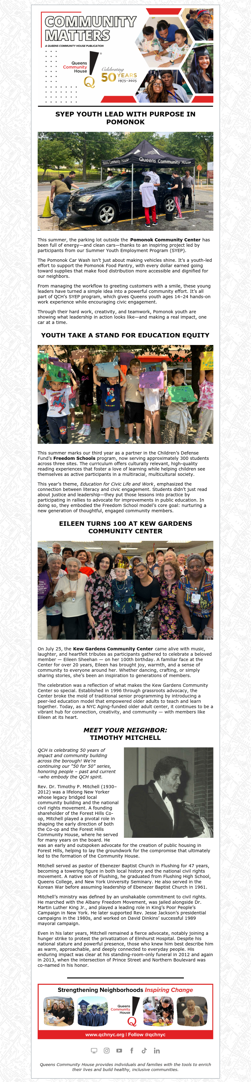 From SYEP youth turning a car wash into a community fundraiser, to Freedom Schools students rallying for education equity, to a 100th birthday celebration at Kew Gardens, July was full of moments that reflect the power of our mission. Plus, our “50 for 50” series honors Rev. Dr. Timothy Mitchell’s legacy.