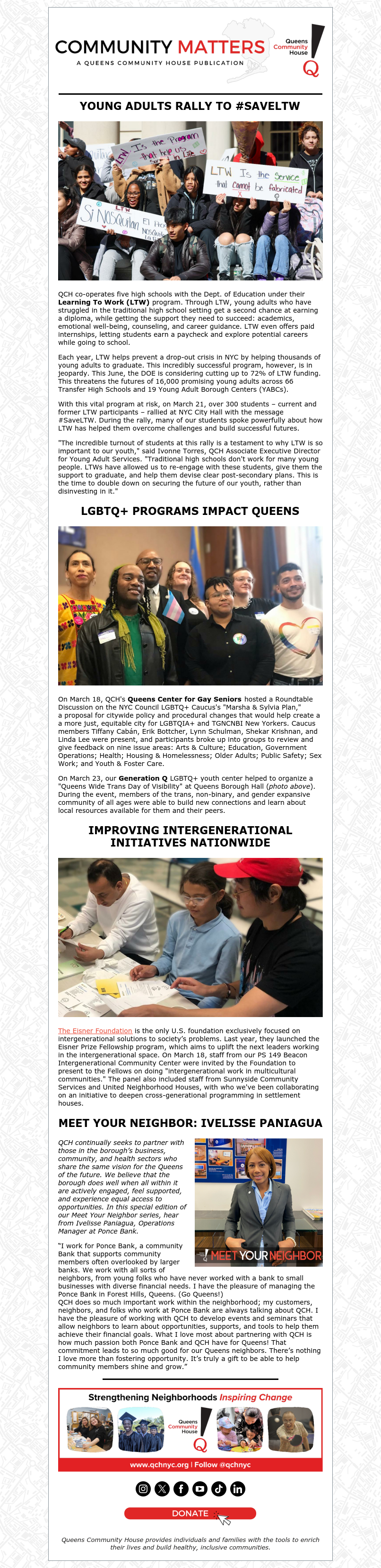 In our latest edition of Community Matters, students from our Learning To Work program lead a rally at the steps of City Hall, Queens Center for Gay Seniors and Generation Q impact Queens, our staff from the Beacon Community Center at PS 149 are invited to speak about our intergenerational work, and Ivelisse of Ponce Bank highlights the shared passion with QCH for supporting the borough. Click here for the full newsletter!