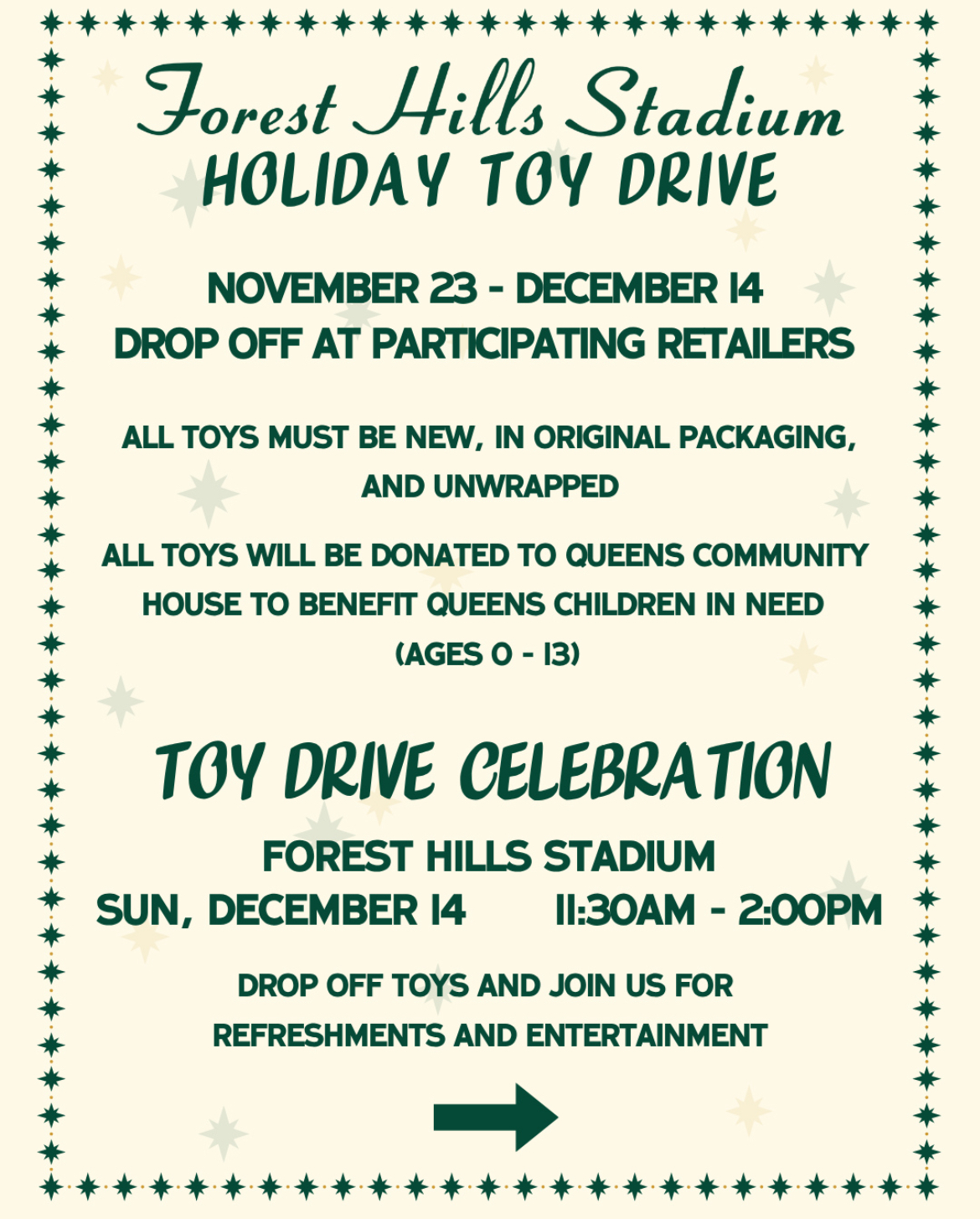 QNS.com: Forest Hills Stadium to kick off annual holiday toy drive this Sunday | November 2025: Forest Hills Stadium will host kick off its third annual holiday toy drive this Sunday, with a number of local restaurants and bars set to begin collecting toys for children ages 13 and under.