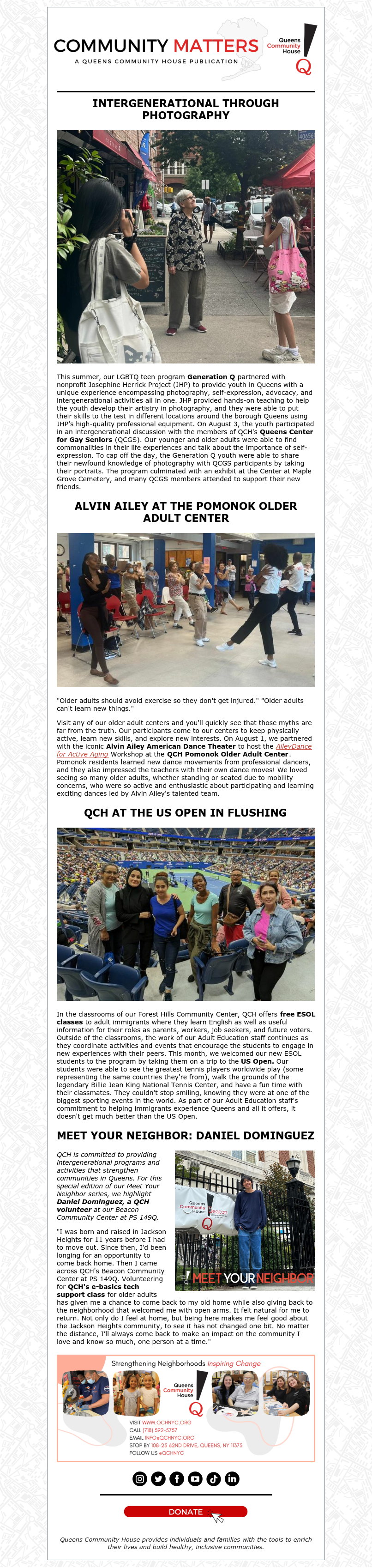 In our Community Matters newsletter for August, we highlight Generation Q and Queens Center for Gay Seniors connecting through photography, Alvin Ailey joining older adults at the Pomonok OAC to debunk myths about aging, our ESOL students taking a trip to the US Open, and a special edition of Meet Your Neighbor featuring a volunteer at our Beacon Community Center at PS 149Q. Click here to view our August newsletter!