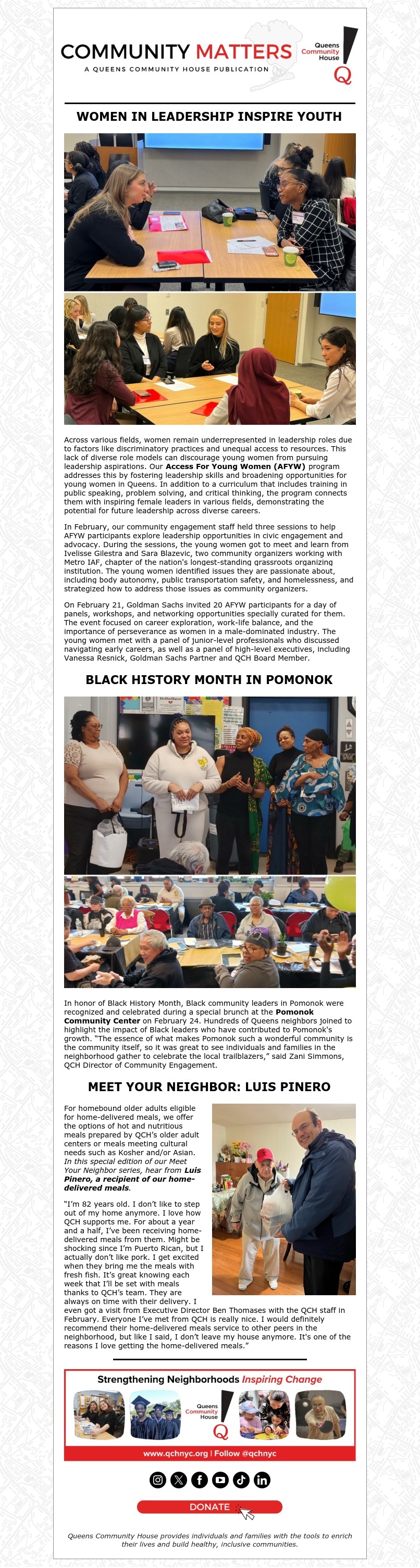 In our February edition of Community Matters, we highlighted Access For Young Women participants being inspired by women in leadership, our Black History Month celebration at the Pomonok Community Center, and the impact of our home-delivered meals on Luis Pinero. Click here for the full newsletter.