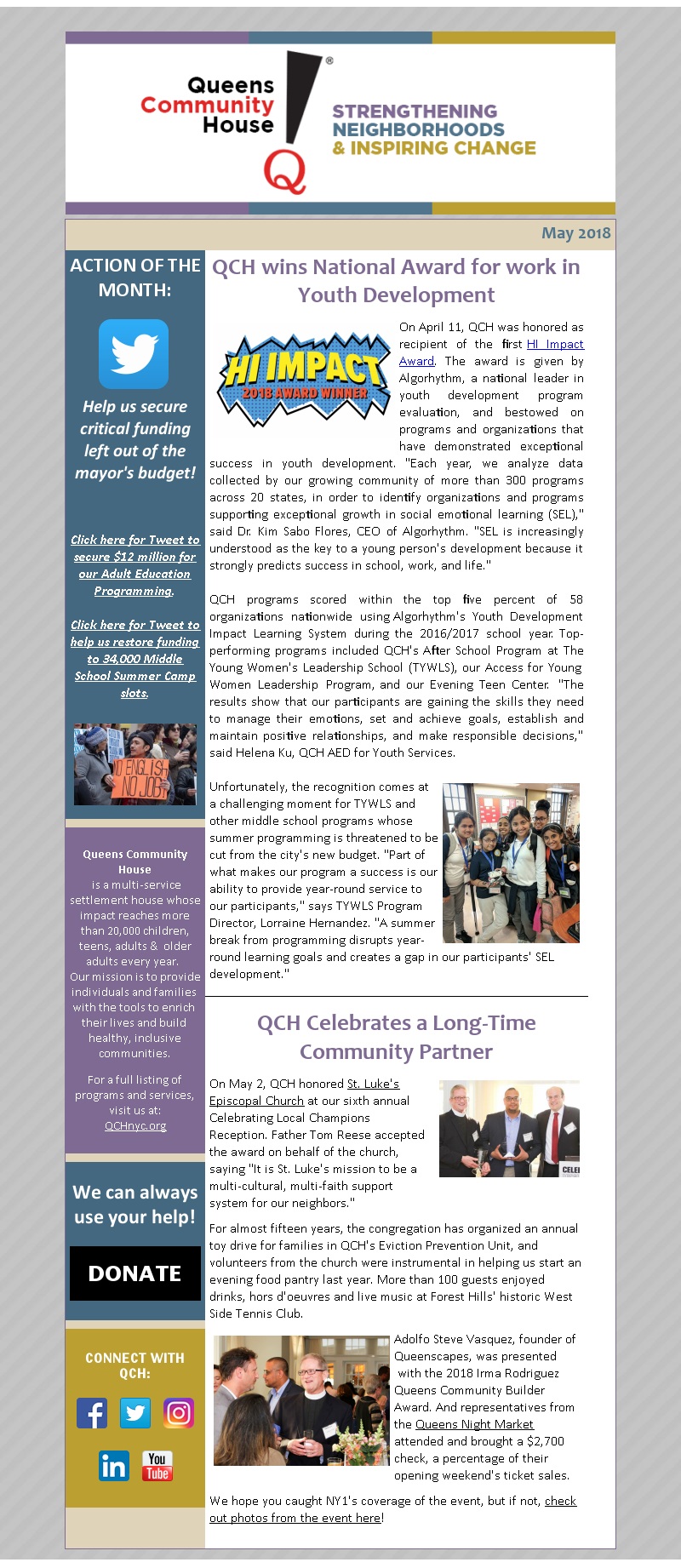 MAY 2018: QCH recognized for its work in Youth Development!